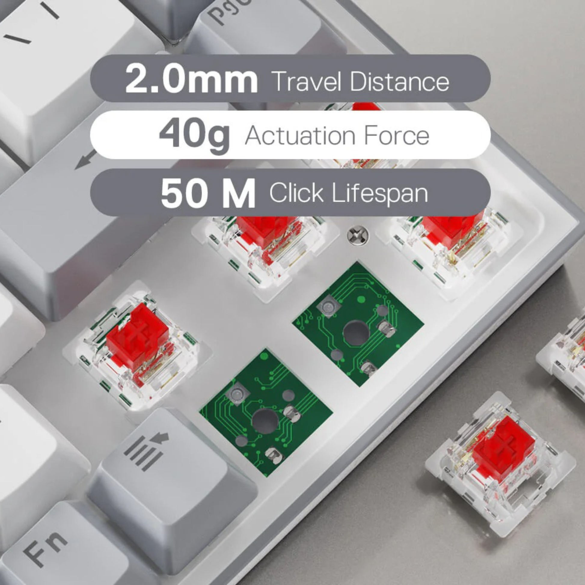 Short Description: The Castor K631 Grey delivers a 65% compact design with 68 keys, hot-swappable red linear switches, vibrant RGB lighting with music sync, and pro-level macro customization.